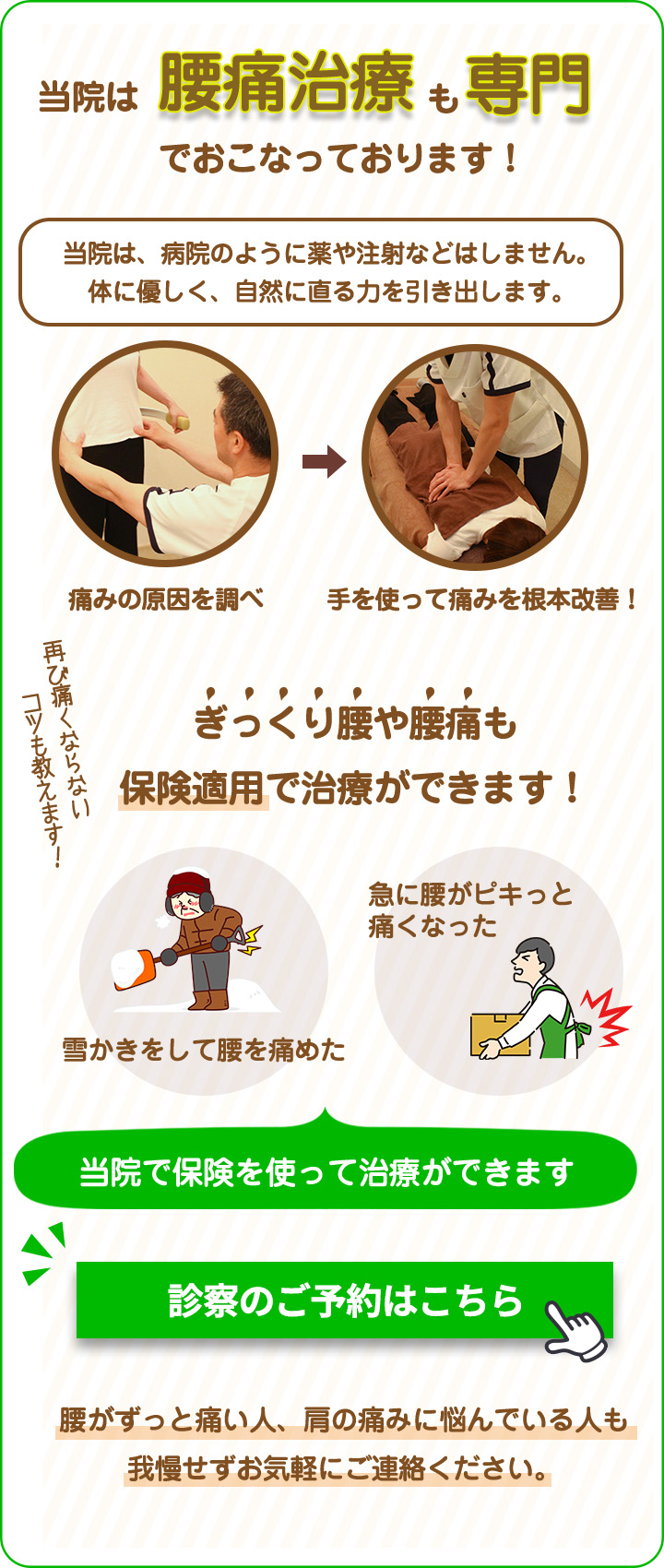 雪かきをして腰を痛めたり、急に腰がピキっと痛くなった時は、当院で保険を使って治療ができます。腰がずっと痛い人もお気軽にご連絡ご相談ください。